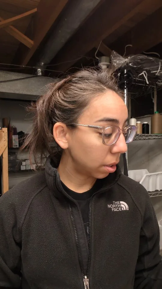 A woman sewing with a green industrial sewing machine in a workshop.